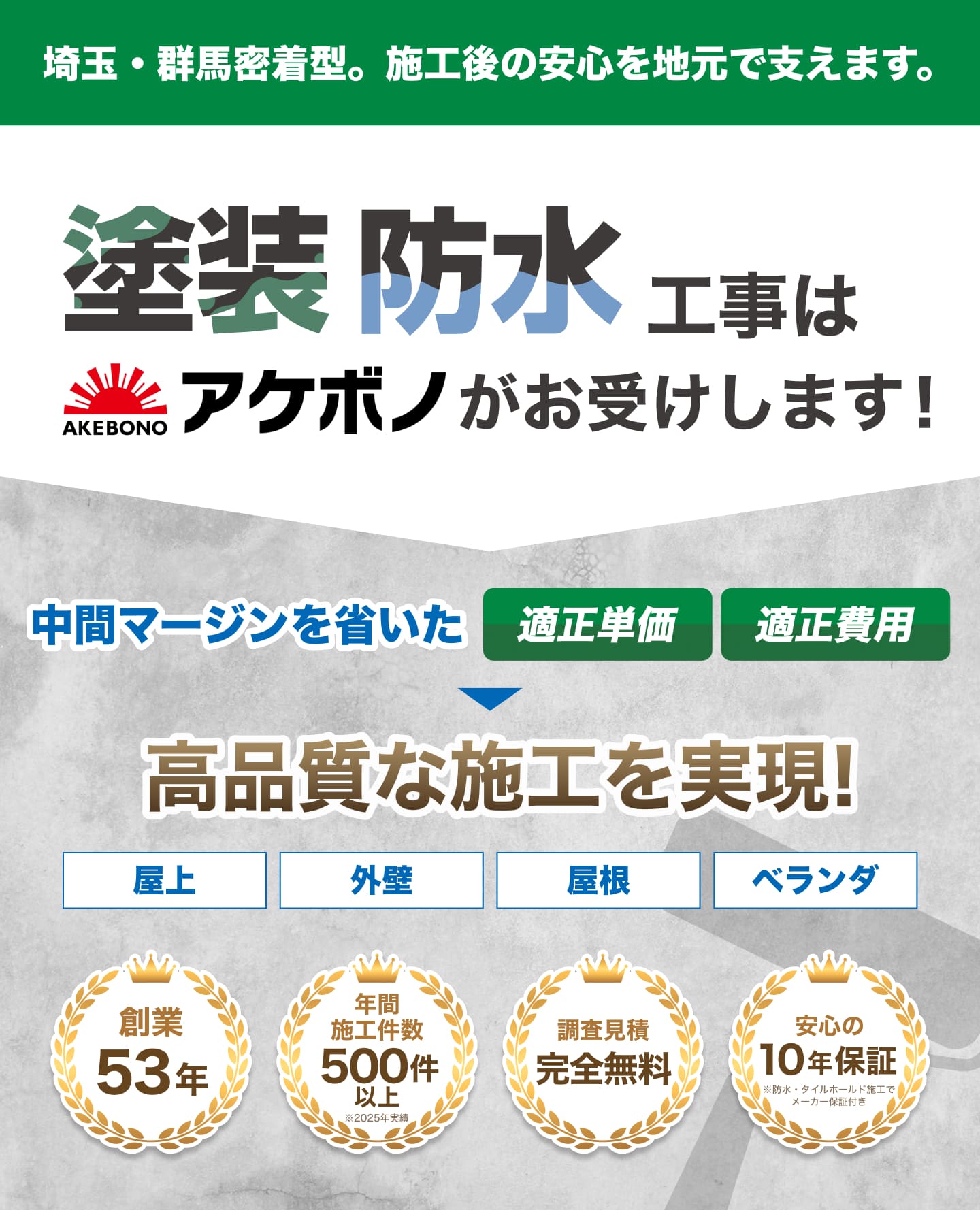 創業53年の豊富な知識と技術。塗装・防水工事はアケボノがお受けします!大規模も一般家庭も中間マージンを省いた適正単価・適正費用で高品質な施工を実現!調査見積完全無料!
